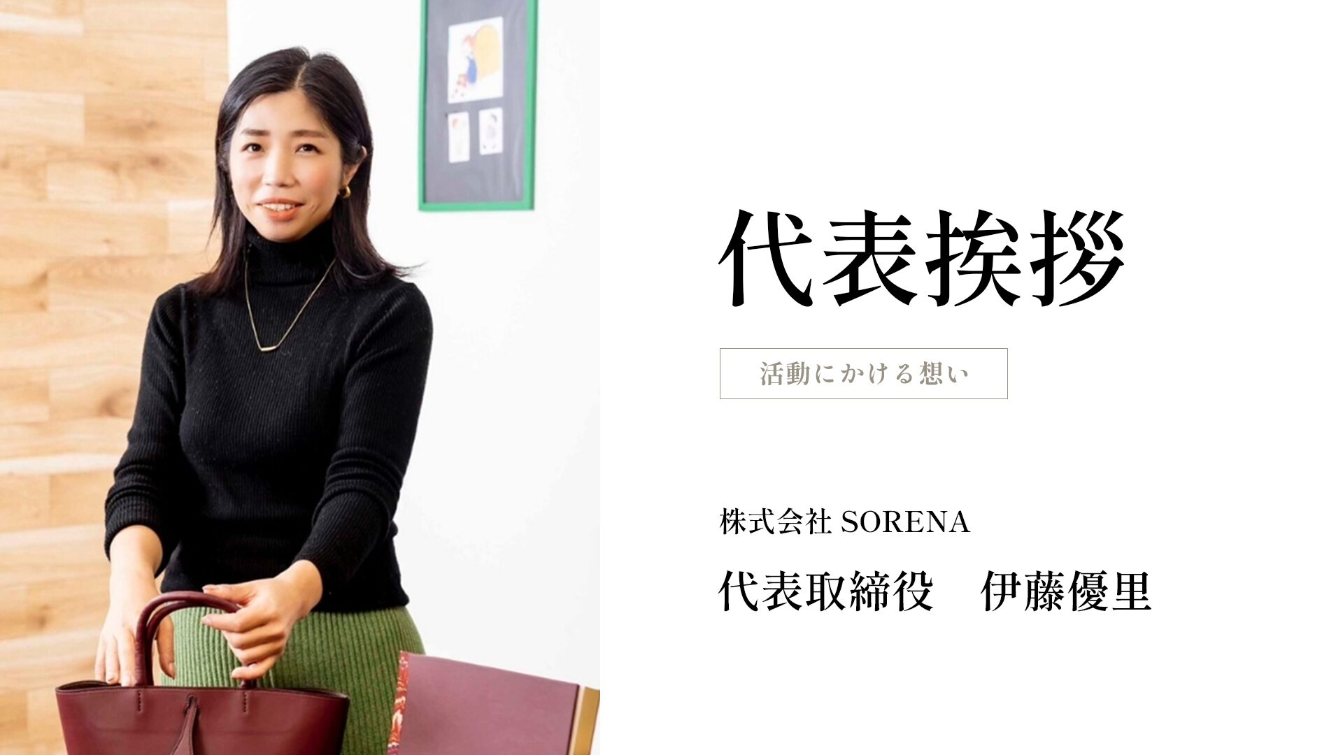 SORENAのホームページへお越しいただきありがとうございます。 弊社は、2021年4月より「株式会社SORENA」を創立いたしました。 時代の移り変わりが加速度的に変化してきている中で、人々が豊かでい続けるために弊社にできることはなんなのか。 今の時代を生き抜くため、新たな価値観や技術の導入はもちろん大切ですが、時代が変わっても守り続けたいものがあります。それは「人との繋がり」と「感動」です。 私はサラリーマンとして、女性として、母として、妻として、 慌ただしい日々を過ごして参りました。 苦労した体験や、辿ってきたルーツを振り返りながら、たくさんの声を聞き、人々の不満や疑問を減らす企画を行うことで、多くの人が人間同士、動物、ひいては環境に対しても、より優しく豊かなライフスタイルを送れるようになれたら、最高に幸せなことだと思っております。 ただ利益を生むことだけを考えるのではなく、きちんと課題解決できる会社を目指します。 時代に合わせ取り入れるべきモノと遺すべき大切なモノに、「感動」という付加価値をのせて 次世代へ繋ぐことが私どものミッションと信じております。